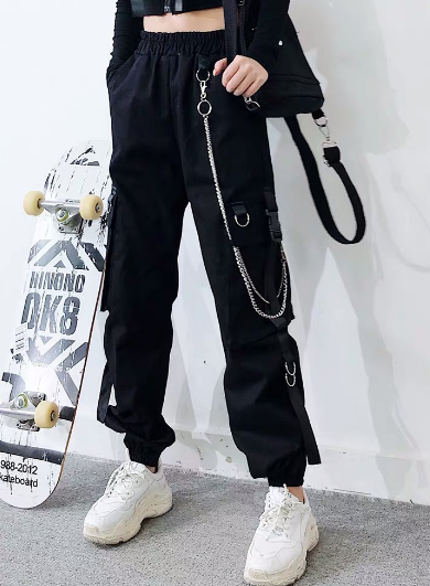 Deze zwarte cargobroek met kettingen, gespen en elastische boorden straalt attitude uit en biedt tegelijkertijd praktisch comfort. Perfect voor wie houdt van een urban stijl met unieke details.